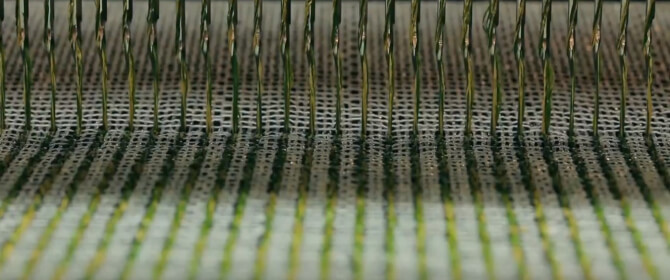 Após isso várias agulhas, e linhas de pontos são realizadas costuradas por minuto, com isso as fibras de polietileno agora são um tapete de grama sintética.
