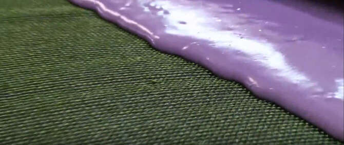 O tapete é enrolado sob um dispensador que espalha um revestimento de látex na parte inferior da grama. Ao mesmo tempo, um suporte secundário também é revestido com látex. Ambos são então enrolados em um rolo, que os transforma em um sanduíche e os une.